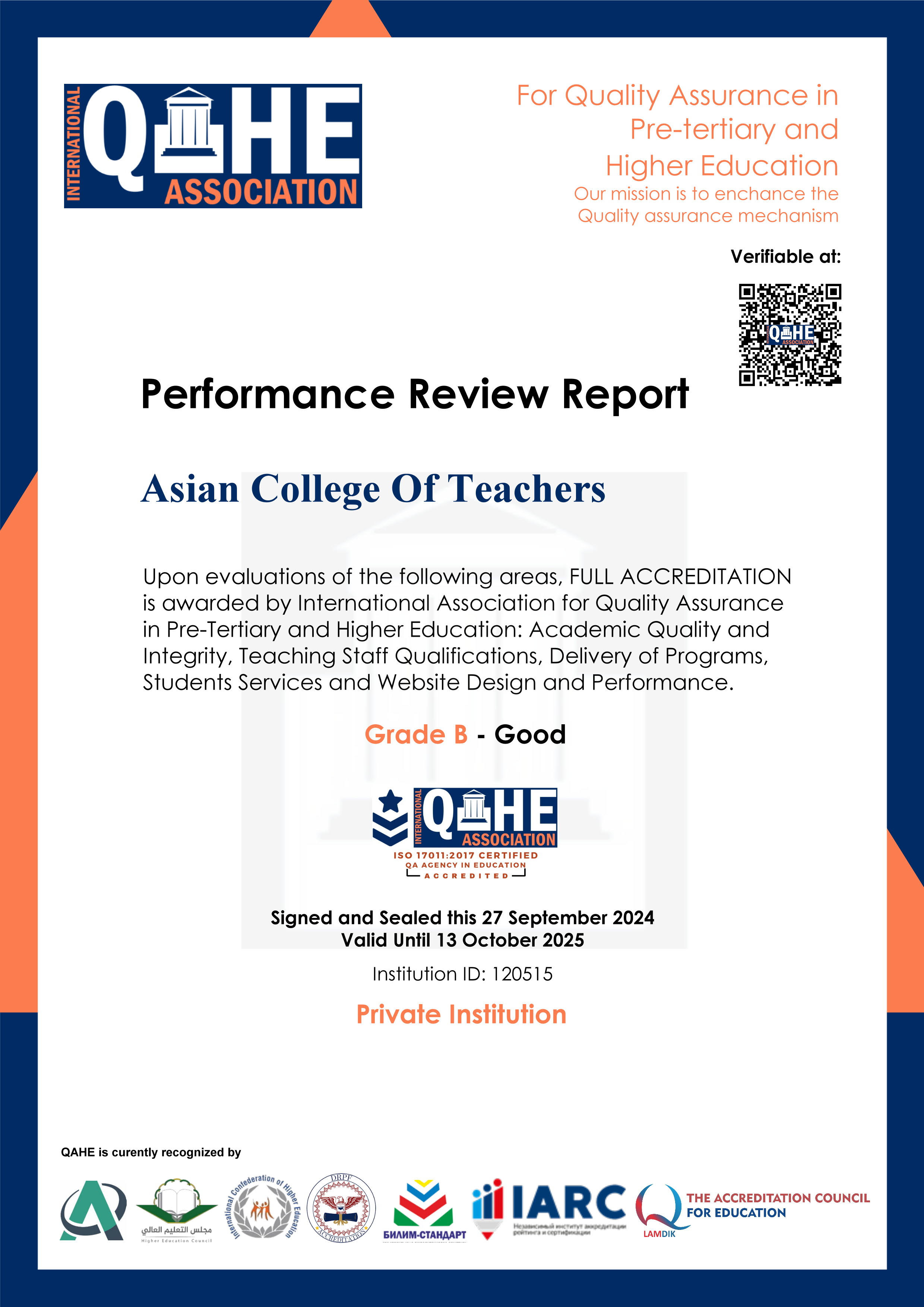 Students enrolling or graduating from Asian College of Teacher can verify ACT’s accreditation at QAHE’s home page under ‘SEARCH INSTITUTIONS’ by typing the name of our institution. https://www.qahe.org/